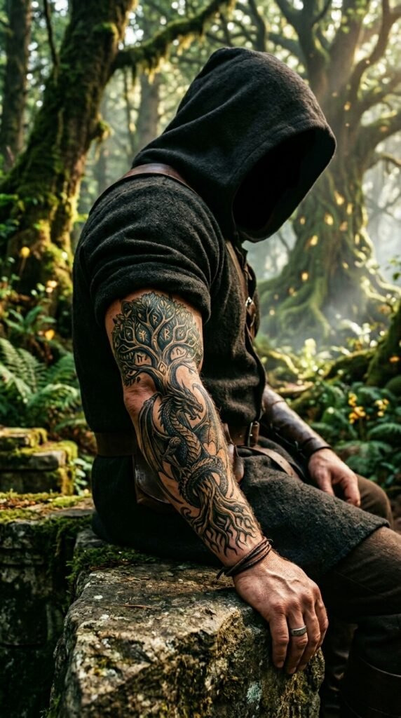 This tattoo symbolizes the connection between nature and power. The sacred tree represents life, renewal, and wisdom, while the dragon brings strength, wisdom, and protection. This is a perfect choice for someone who values both spiritual growth and the power to overcome obstacles. It speaks to the importance of grounding oneself while embracing inner power.