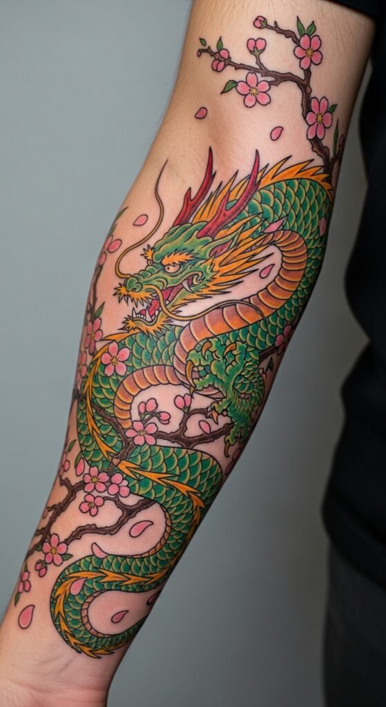 The combination of a dragon with cherry blossoms blends the symbols of life’s transient nature and enduring strength. In Japanese culture, the cherry blossom represents the fleeting beauty of life, while the dragon stands for eternal power and wisdom. This tattoo is perfect for someone who values the balance between power and the appreciation of life’s moments.