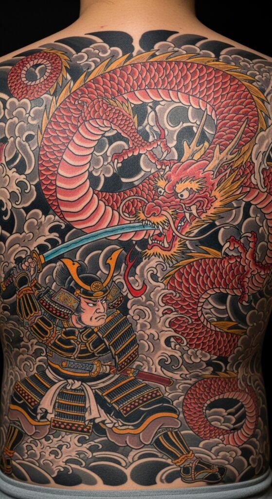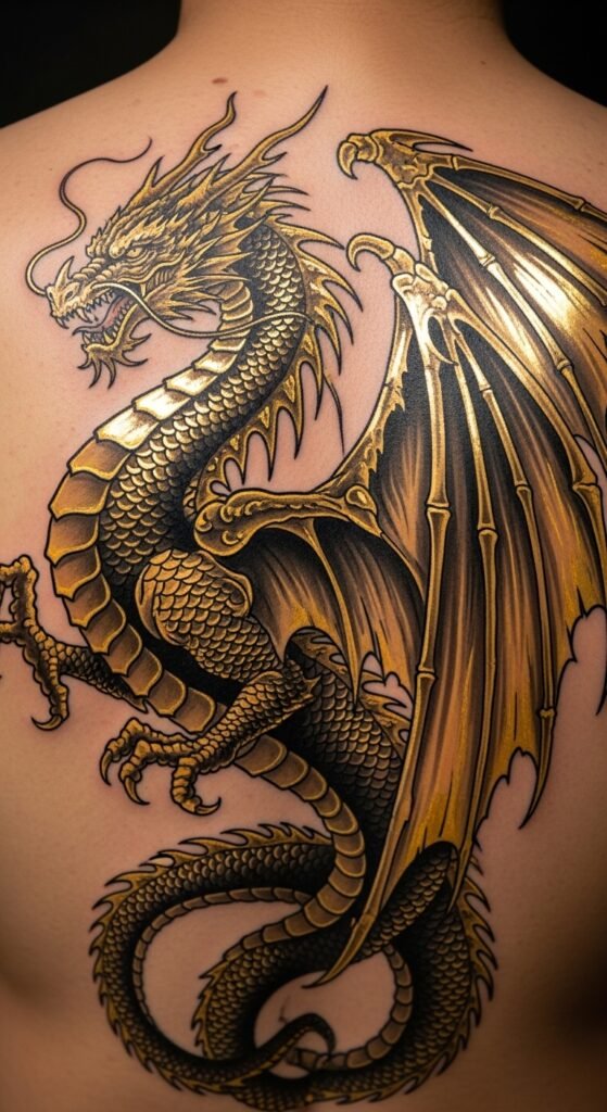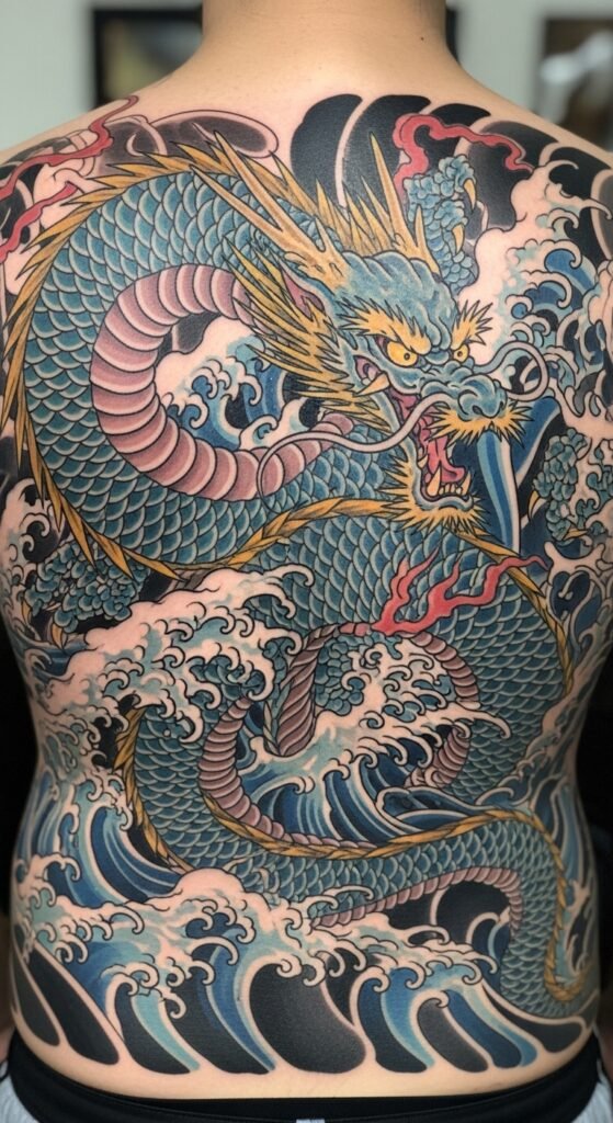 The gold detailing in this tattoo brings a sense of luxury and prestige to the traditional dragon design. Gold is often associated with wealth and wisdom in Japanese culture, and this tattoo symbolizes not only strength but also a desire for success and prosperity. It’s a great design for someone who wants their tattoo to signify power and achievement.