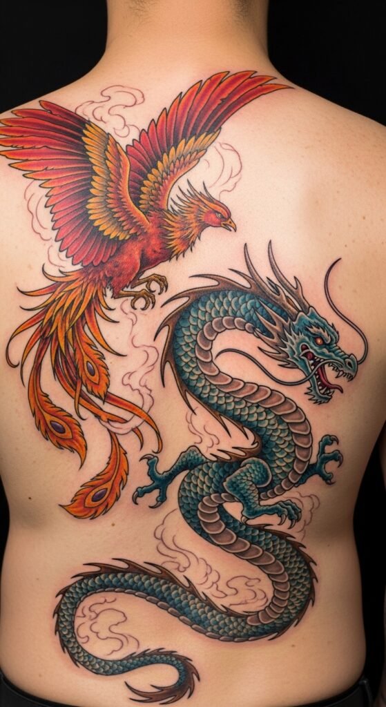 The dragon and phoenix are traditional symbols of yin and yang in Japanese mythology, representing the balance of opposites. This design symbolizes harmony, transformation, and the endless cycle of life and death. It’s a perfect tattoo for someone who values the balance between strength and renewal.