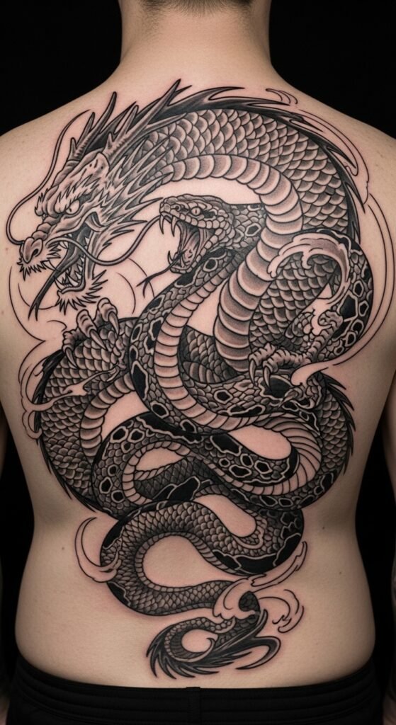 The dragon and snake tattoo represents the duality of life, combining strength with cunning. The snake is often seen as a symbol of transformation and renewal, while the dragon represents wisdom and might. This design is perfect for someone who embraces both their intellectual and physical strength, as well as the balance between the two.