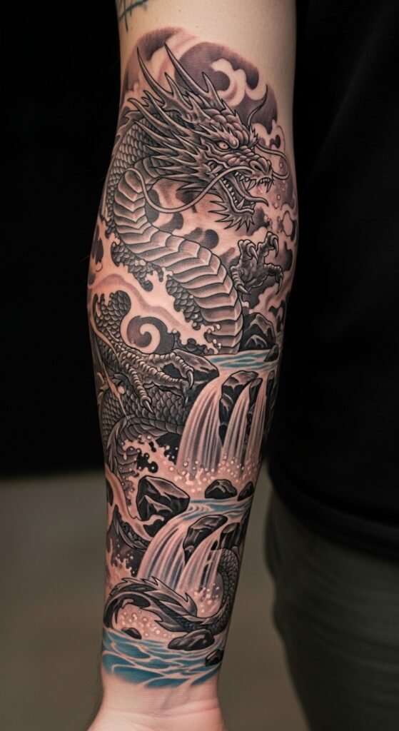 Waterfalls in this design represent the flow of time and the power of nature. The dragon weaving through the cascading water signifies adaptability and the constant motion of life. This tattoo is ideal for someone who believes in embracing change and using it as a source of personal strength and transformation.
