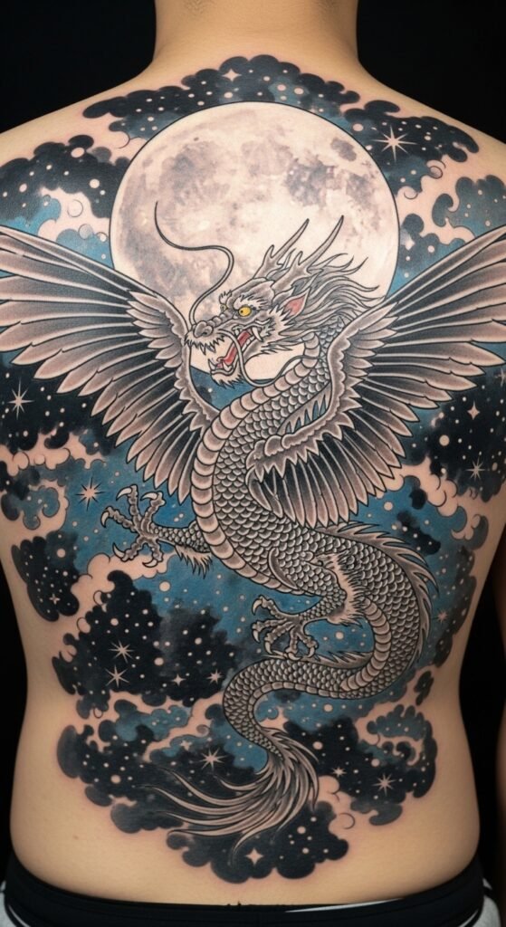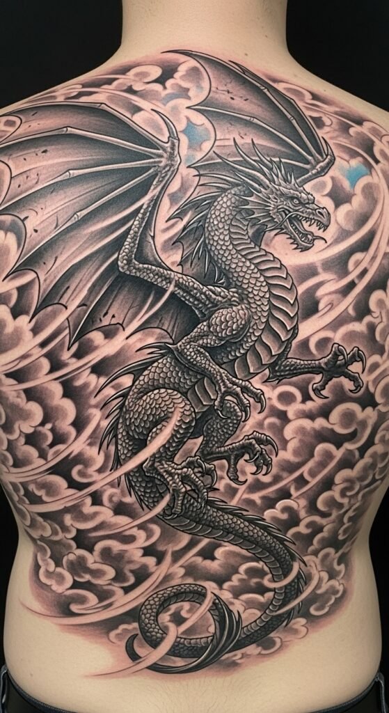 This tattoo design combines the power of the dragon with the softness and mystery of the clouds. The clouds are often used in Japanese tattoos to represent the celestial realm, and their inclusion here enhances the dragon’s divine and otherworldly nature. It’s a great tattoo for someone who feels a connection to both the earthly and spiritual worlds.