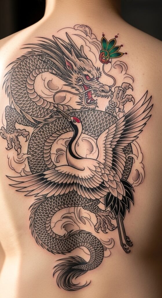 The combination of the dragon and crane in this tattoo represents harmony and balance. While the dragon is a symbol of strength and protection, the crane brings peace, longevity, and wisdom. This design is perfect for someone who values the balance between strength and tranquility, and who strives to live a life of peace while maintaining inner strength.