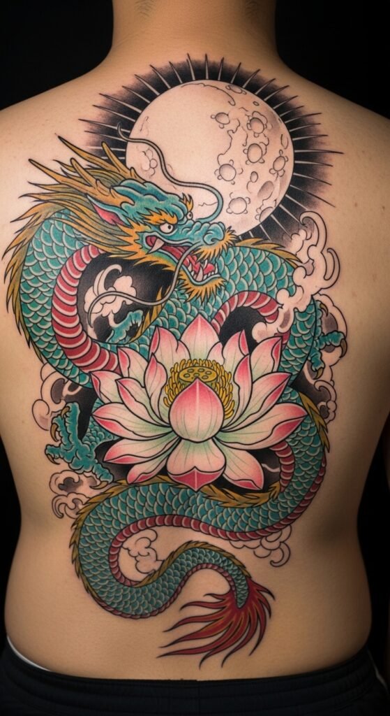 This tattoo design combines the wisdom and power of the dragon with the purity and enlightenment of the lotus flower. The full moon adds a sense of peace and spiritual insight, making it a perfect tattoo for someone on a journey of self-discovery and spiritual growth.