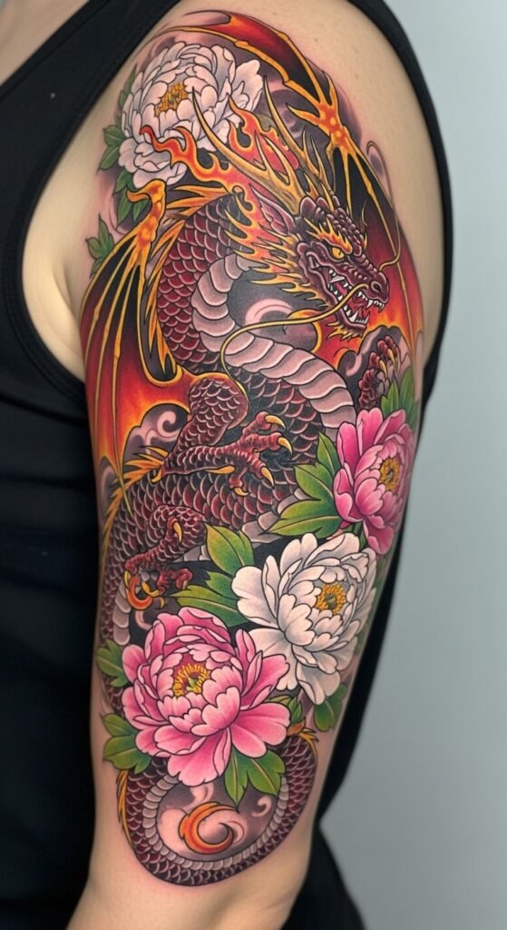 The peony flower in this design represents beauty, prosperity, and strength. Paired with the dragon, it creates a balance of power and elegance. This tattoo is perfect for someone who seeks to combine strength with beauty, and values both inner power and external grace.