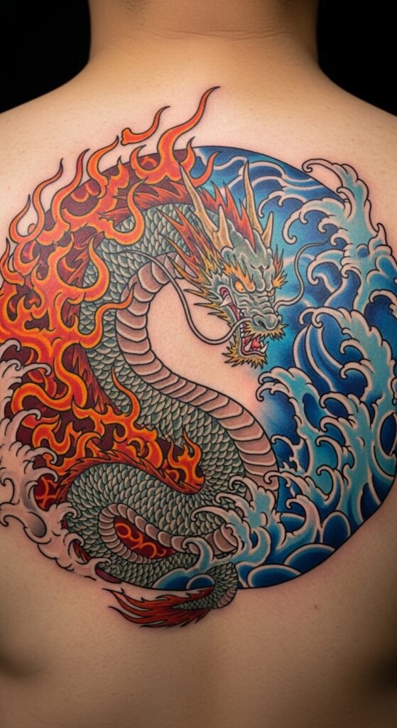 This tattoo design represents the balance between opposing forces. The fire and water symbolize the duality of life—passion and tranquility, destruction and creation. The dragon’s role is to maintain balance, making this an ideal design for someone who values harmony and the ability to navigate life’s challenges with balance.