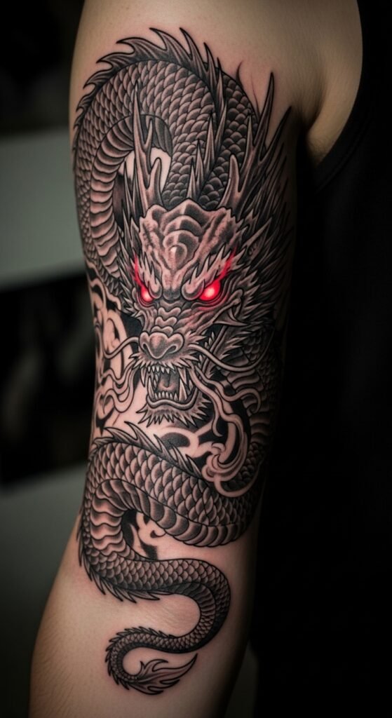 The red eyes of the dragon symbolize fire, passion, and an intense spirit. This tattoo design conveys a sense of strength and determination, perfect for someone who wants their tattoo to radiate power and focus. The dragon’s gaze is piercing, symbolizing the ability to see through challenges and remain steadfast in pursuit of goals.